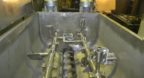 Устройство ленточного смесителя. В качестве рабочего органа ленточного смесителя используется вал с навитой лентой . В основе работы - процесс смешивания со сдвигом, продукт с помощью ленты перемещается слоями . Смешивание производится ленточными спиралями , которые не только перемешивают , но и передвигают смешиваемый материал . В смесителях непрерывного действия лопасти закрепляются на валу по винтовой линии , что обеспечивает одновременное перемешивание и перемещение продукта вдоль вала . Подробнее