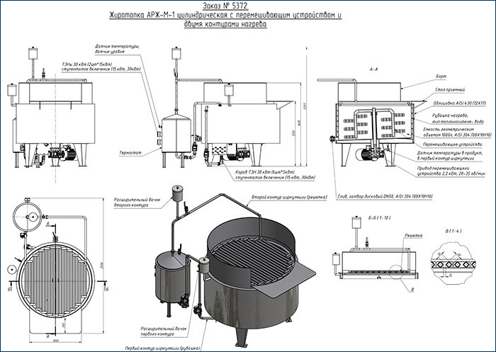 Жиротопка - двустенный сосуд, установленный вертикально на опорах, из нержавеющей стали, укомплектован электрическими ТЭНами и циркуляционным насосом. Жиротопка (агрегат быстрого растопления жиров) имеет пульт управления, включающий пускатели ТЭНов и термодатчик для регулирования температурных режимов в плавителе |