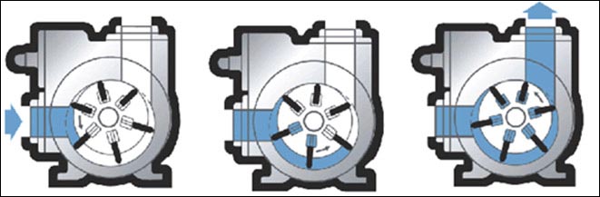 Рабочий орган пластинчатоо (шиберного) насоса выполнен в виде эксцентрично расположенного ротора, имеющего продольные радиальные пазы, в которых скользят плоские пластины (шиберы), прижимаемые к статору центробежной силой. Так как ротор расположен эксцентрично, то при его вращении пластины, находясь непрерывно в соприкосновении со стенкой корпуса, то входят в ротор, то выдвигаются из него. Во время работы пластичатого (шиберного) насоса на всасывающей стороне образуется разрежение и перекачиваемая масса заполняет пространство между пластинами и далее вытесняется в нагнетательный патрубок. . |
