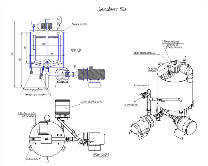 Сироповарка предназначена для приготовления сахарного сиропа, инверта, роспуска возвратных отходов и др. и других продуктов, требуемой концентрации. Сироповарка - это трехслойная емкость из нержавеющей стали с рубашкой, пар или глицерин под давлением, утепленная минеральная вата, дно на опорах в виде конуса, и крышка 1/3.